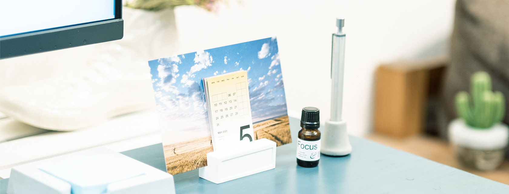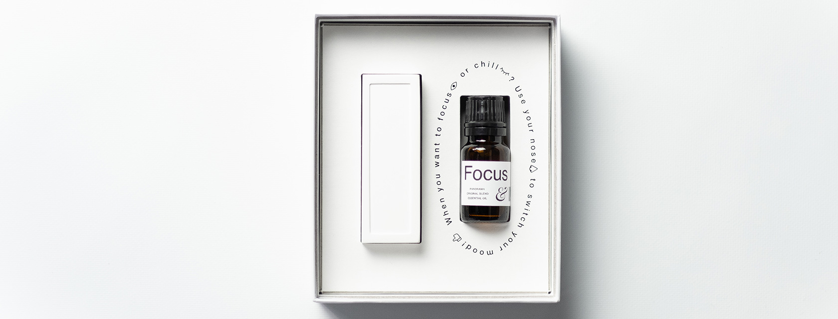 この働き方は2021年以降、新時代のスタンダードになる可能性もあります。 そこで我々は自宅で働く上で最も重要な「メリハリのトリガー」を提供したいと考え、デスクトップに置くことのできるアロマストーンとカレンダーを制作いたしました。 アロマオイルは集中力や記憶力を高める効果のある成分をオリジナルで調香し、仕事など集中が必要な際に効果が期待されるものとなっております。また、そのアロマオイルを垂らすアロマストーンはパノラマのロゴマークを形どったシンプルなフォルムを採用し、珪藻土を使用することで香りの広がりを高めます。 そして付属のカレンダーは平日だけが可視化できる仕組みになっており、「意外と少ない平日」を直感的に意識できるデザインになっております。 平日は目の前の仕事に集中(Focus)しながら一日を大切に。