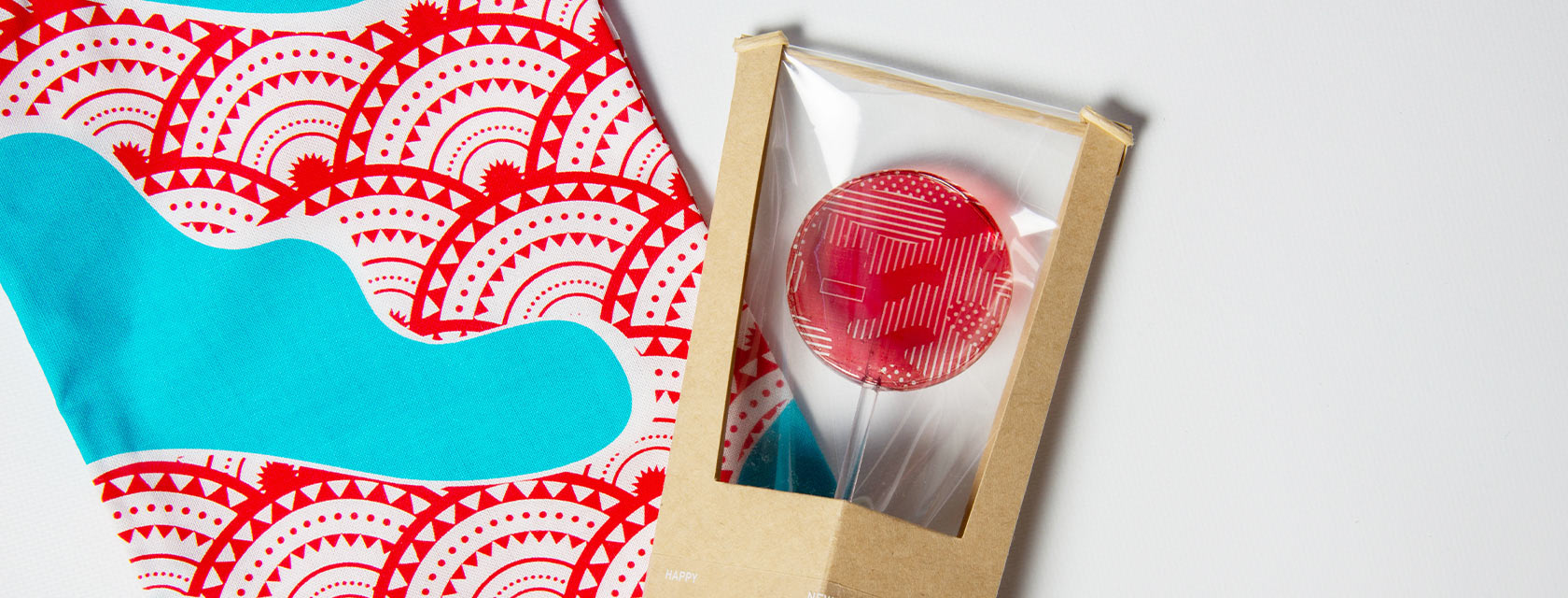 前年夏に制作した団扇の流れを継承したグラフィックを飴と巾着に採用。パッケージには水引の上に干支である「犬」の落書きを施し、遊び心を演出しました。