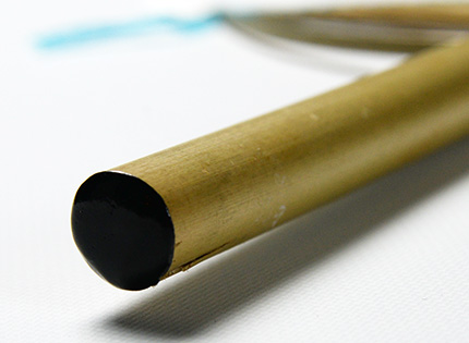 丸柄は中の肉を取って柳を詰めています。柳は春からお彼岸の間までに皮が剥けるので、その期間に切って乾燥させておきます。それを柄の中に詰めて穴を塞ぐのですが、穴を塞ぐ際にはマネキンやひな人形を作るときにも使う、貝殻の粉である胡粉(ごふん)に膠(にかわ)を溶かして糊状にしたものを塗って柄に栓をします。