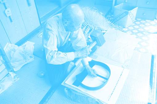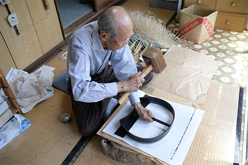 私は長い間弓作りをしており、今でも1日に3,000本ほど削りますが、うちわ作りで使う刃物は全て刀鍛冶屋さんに頼み、地金の堅い鍛えられた鋼を使っています。そうすることで、内と外で肉質が違う竹の柄に弓を通す穴を開けるときも、綺麗に開けることができます。また、竹の質も一本一本違うため、綺麗に穴を開けるのも糸を編むのも人の手のほうが早い。今でも21工程全てを手作業で行っているため機械は一切使っていません。