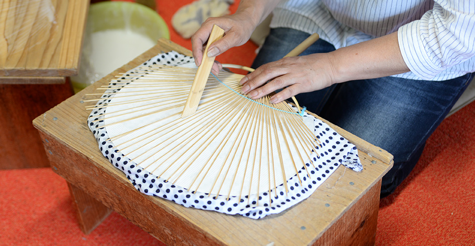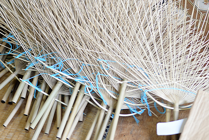 持ち手の丸柄も房州うちわの特徴ですが、その上部に開いた穴に差し込まれ、円弧状になっている竹串(弓)を作る「弓削(ゆみすげ)」の作業や、弓を差し込んでうちわを形作る「窓作り」は職人技の見せ所。特に弓削は難しく熟練の技が要求されます。